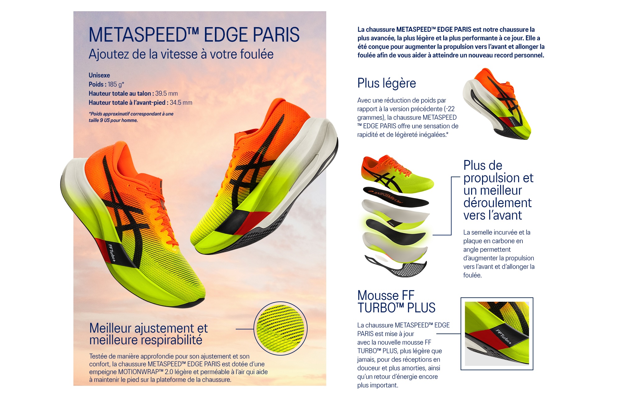 Les chaussures de course METASPEED™ EDGE 3 sont conçues pour les coureurs dont le style est basé sur la cadence et qui souhaitent démarrer vite et finir encore plus vite. Les coureurs portant ces chaussures pourront augmenter leur vitesse en augmentant le nombre de foulées et en conservant de l’énergie à chaque pas.