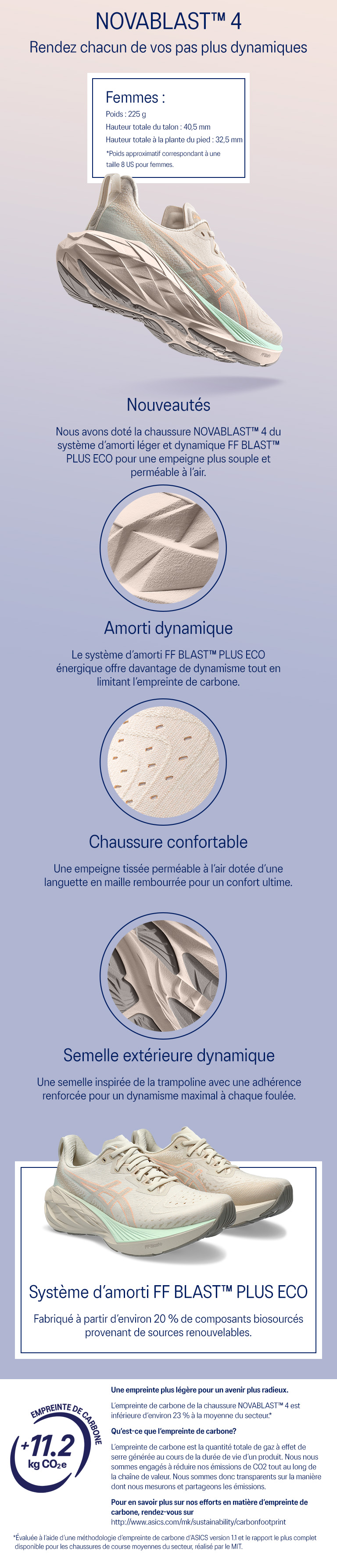 La chaussure de course NOVABLAST™ 4 présente une nouvelle géométrie de semelle intercalaire et extérieure qui aide à produire une course énergique.